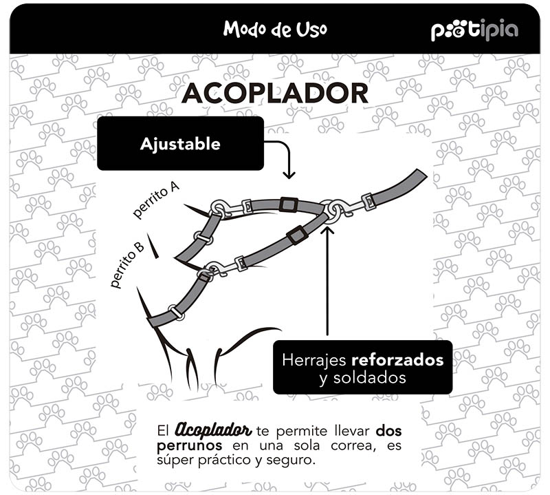 Acoplador de Nylon con herrajes reforzados y soldados, ajustable. Permite llevar dos perritos en una sola correa. Práctico y seguro.