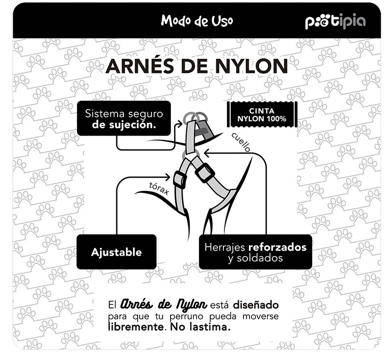 Arnés de Nylon con herrajes reforzados y soldados, sistema seguro de sujección, ajustable para que el perruno pueda moverse libremente. Material 100% nylon.