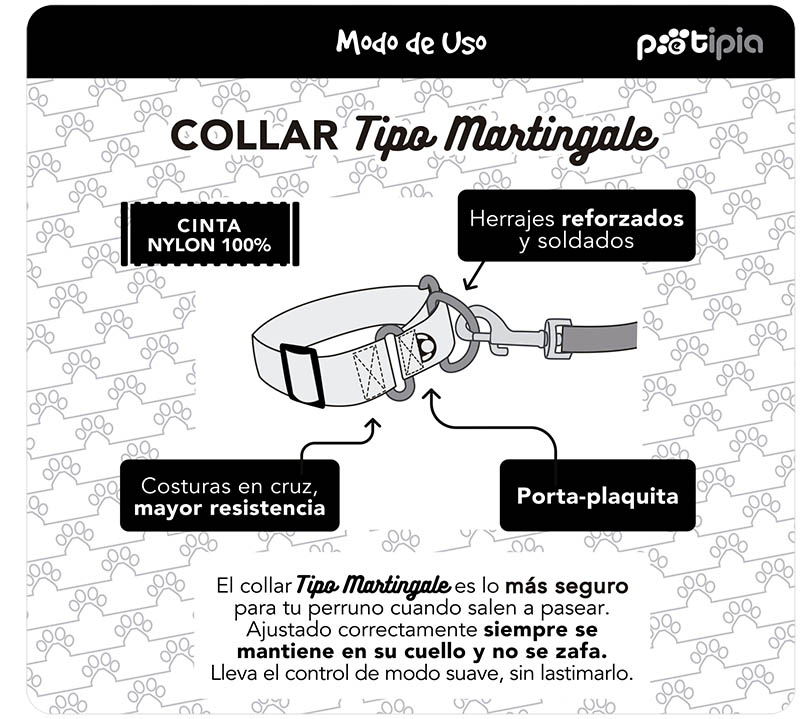 Collar Martingale de Nylon con herrajes reforzados y soldados, costuras en cruz para mayor resistencia y portaplaquita. Material 100% nylon. Se ajusta al tamaño del cuello del perruno para cuando éste se jala.