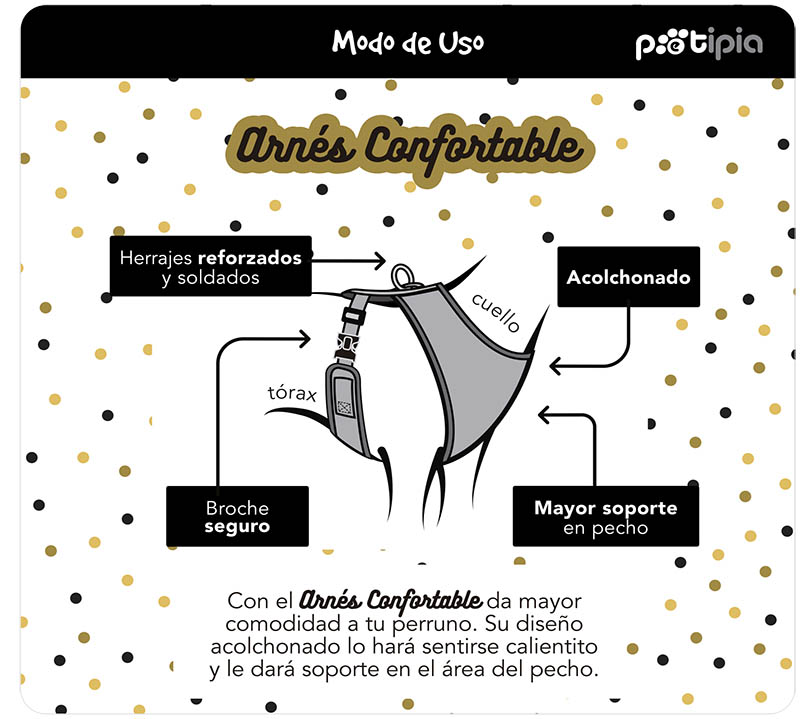 Arnés Confortable con herrajes reforzados y soldados. Acoginados para mayor comodidad en el paseo cotidiano. Soporte en el área del pecho. Apto para lavadora.